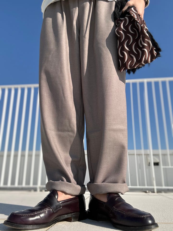 【素材感・着心地】ゆったりしたシルエットですが、裾口に向かってテーパードしている為、カジュアル過ぎない印象です。