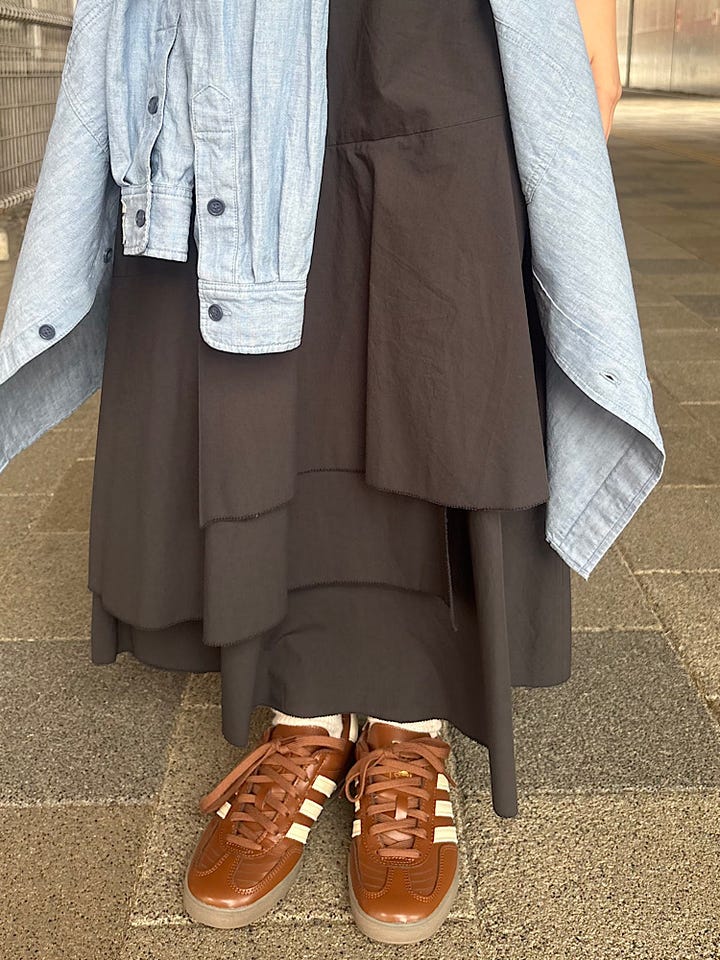 着心地 :柔らかい生地感で春夏のスカートにピッタリの一枚。膝下からフレアシルエットで、膨張しすぎないスカート。