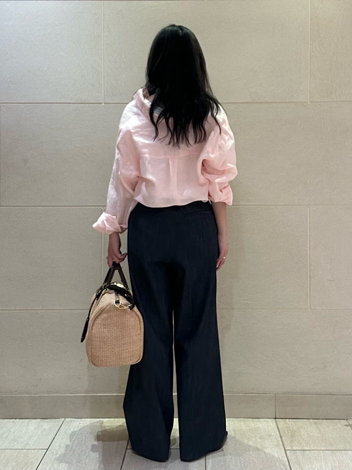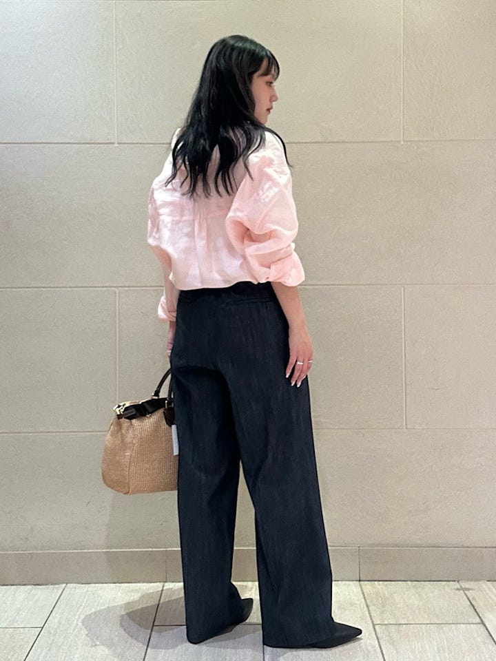 素材感/着心地:デニム風なのできちんと見えします!タック入りでシルエットが綺麗です。