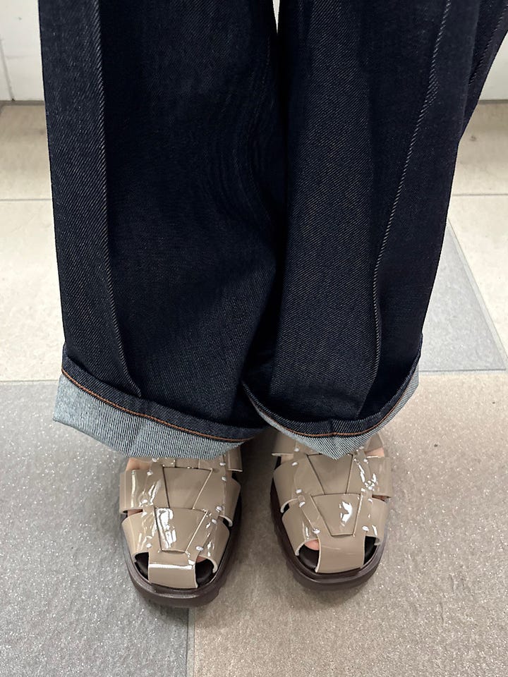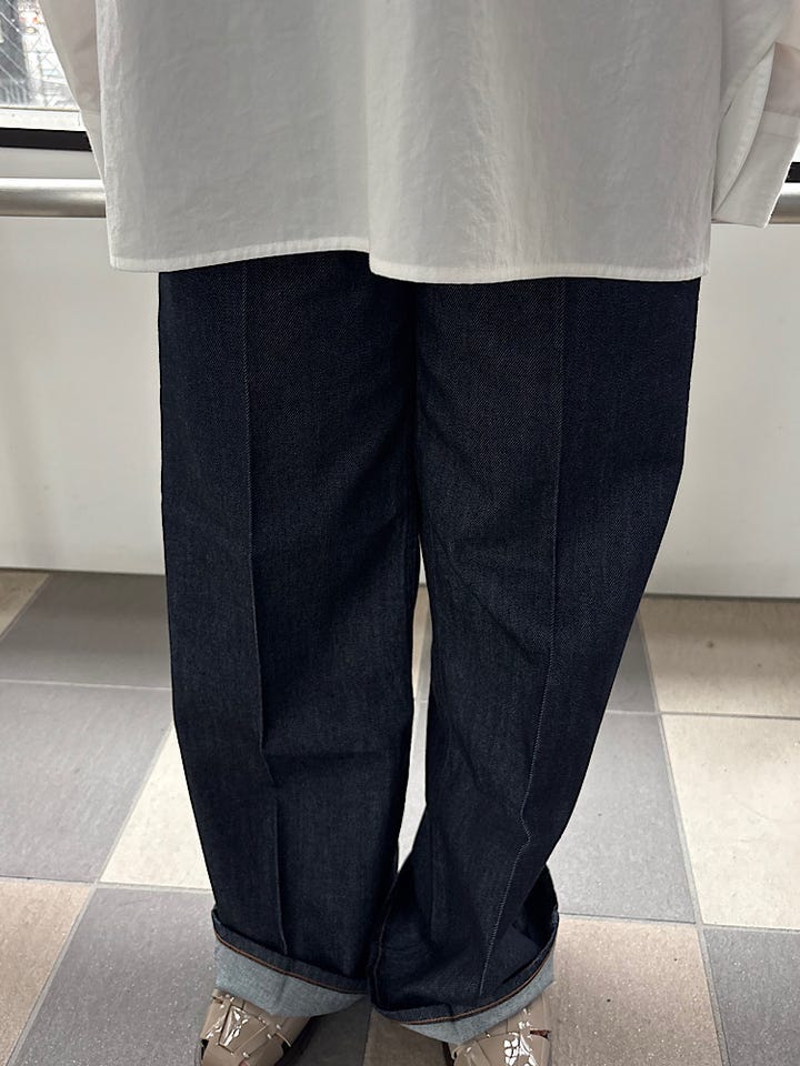 着心地 :見た目は硬い生地感に見えるが、履き心地がとてもよく柔らかい。インディゴカラーはステッチがしっかり見えてアクセントに。