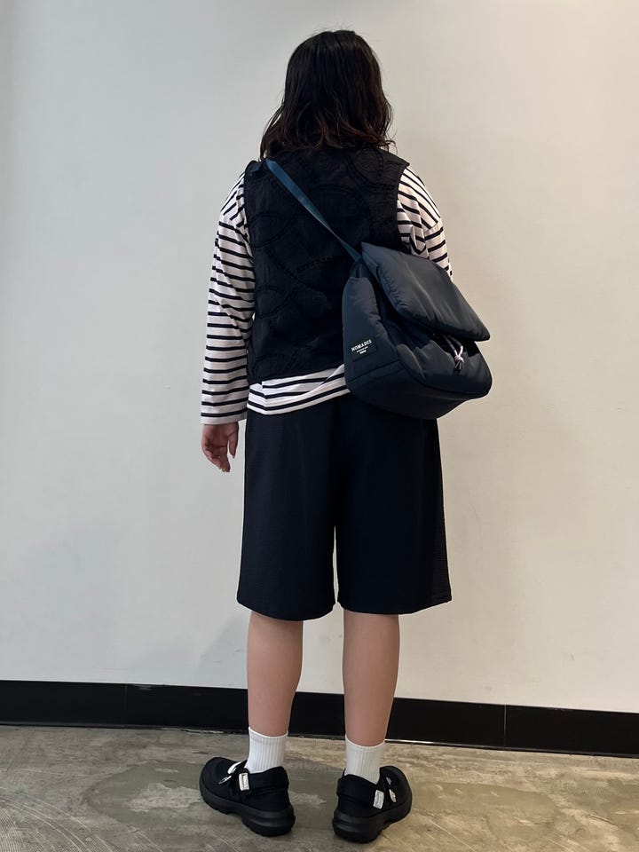 着心地:さらっとしているベストで夏でも快適に着れます。Tシャツだけだと物足りない時に羽織るだけでアクセントになります。フロントフックなので全部閉めても開けても雰囲気変わるので着回ししやすいです。