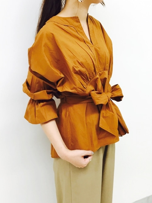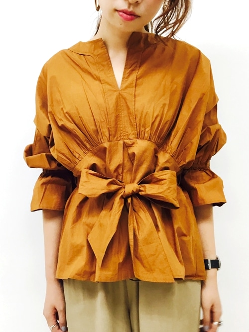 胸元にかけてはいるギャザーが、華やかな印象のブラウス。
