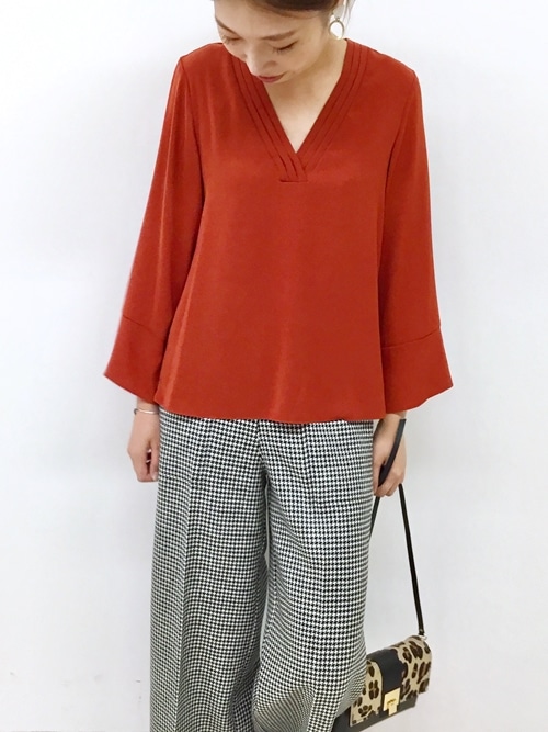 今年トレンドカラーの赤がポイントのコーディネート。 深みのあるワインレッドの色味は派手すぎずプラスしやすいアイテム! チェックのパンツと合わせて秋を漂わせる雰囲気に。