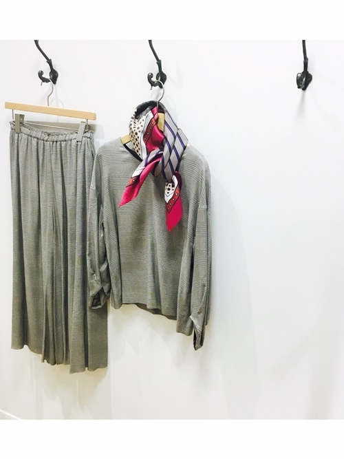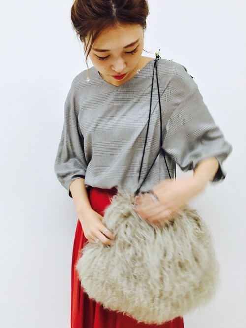 グレーンチェックに上品な赤のスカート合わせで秋の装いに。 ボリュームのあるファーバックをコーディネートのアクセントに。