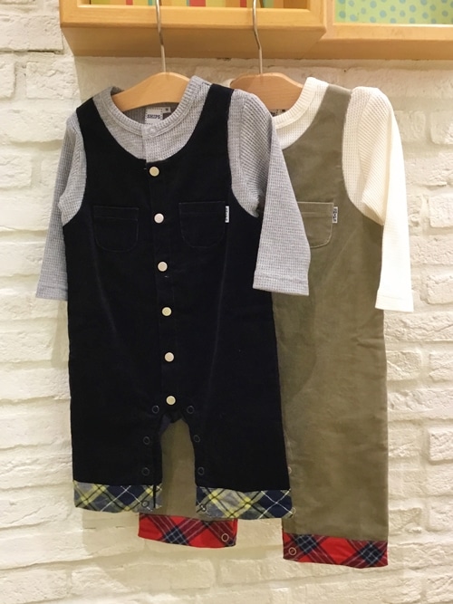 一見オーバーオールを着ているような、フェイクデザインのロンパースのご案内です。パンツの裾部分はチェックになっていて、アクセントになっています。リバーシブルのCAPと合わせました!