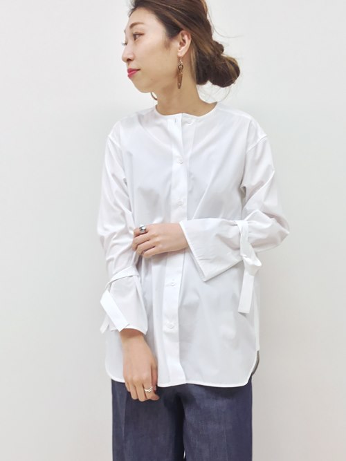 ジャケットを使用したスタイリングのご紹介。デニムのワイドパンツと合わせて、カジュアルなスタイルにも◎中に着ているノーカラーのシャツはトレンド感のあるデザインで、袖をチラッと見せてきて頂くと、ワンランク上のコーディネートも楽しんで頂けます。