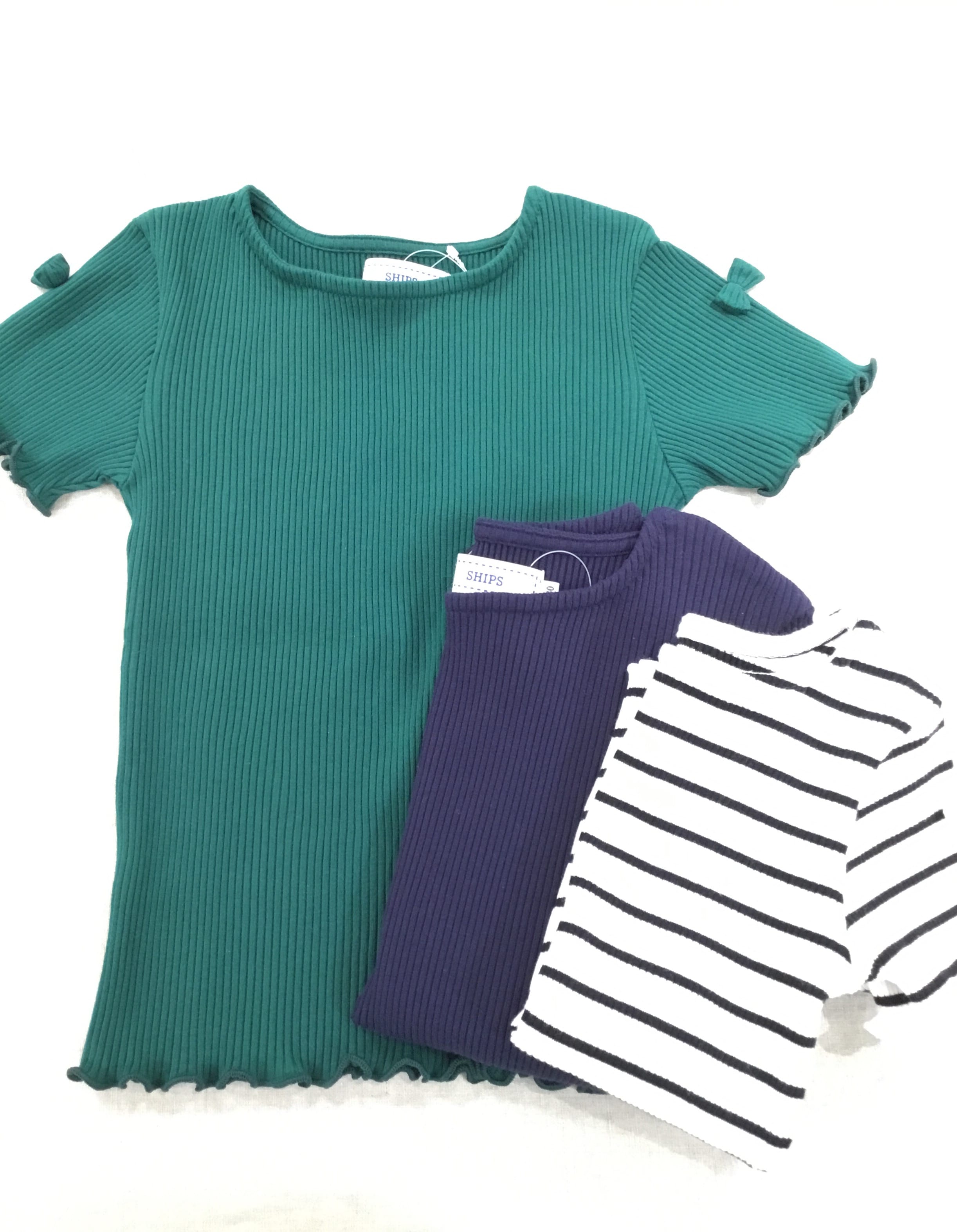 人気のジャンパースカートのご紹介です♪ ギャザーがたっぷり入っていて動きやすく、ボリューム感がとっても可愛いですよ☆ トップスは少し早いですがこちらも人気のリブTシャツを合わせました。袖のリボンがポイントです♪しっかりした生地なので今の時期はインナーとしてもオススメです。 どちらもベビーサイズから展開しています。