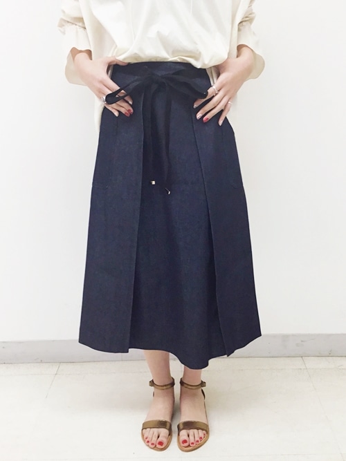 しっかりとした生地のスカートとふんわりした女性らしいブラウスで、 女性らしさの中にマニッシュさも足したコーディネート。 足元の肌見せも女性らしさのポイントです。