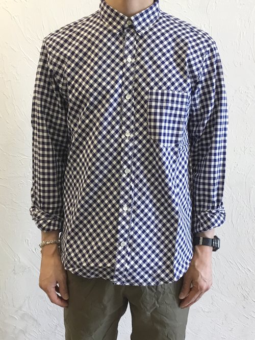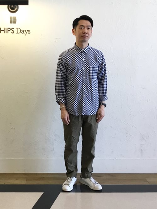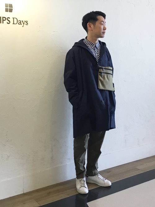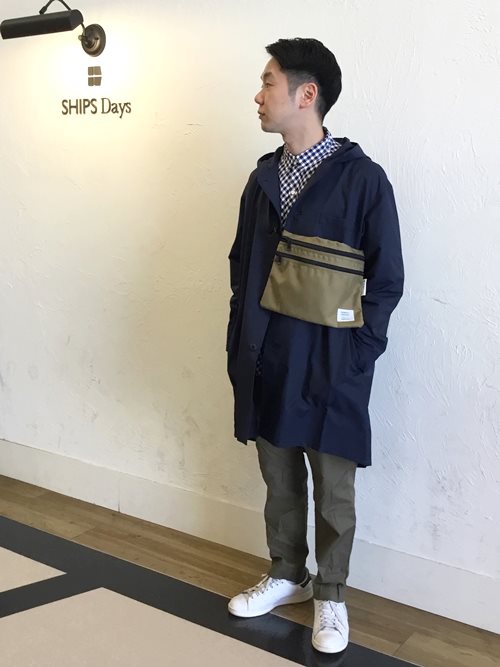 SUNNY SPORTS×SHIPS Daysのノーカラーフードコートにバイアス使いのギンガムチェックシャツのコーデ。爽やかなお出かけスタイルの提案です。