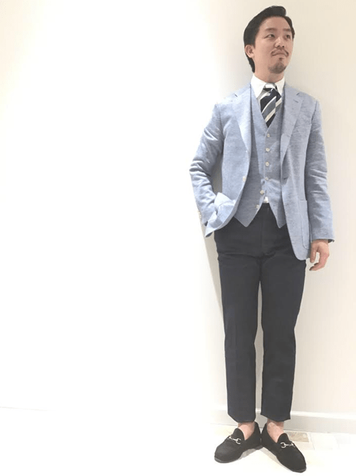 夏らしい清涼感のあるジャケパンスタイル。 はっきりしたブルーのリネンジャケットに足元はスエードのビットローファーをチョイス。 大人の余裕溢れるスタイルに仕上がりました。
