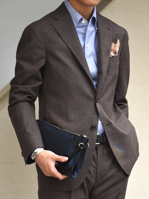 落ち着いたブラウンカラーのセットアップにシャツとバッグをブルー系で揃えたコーディネートです。