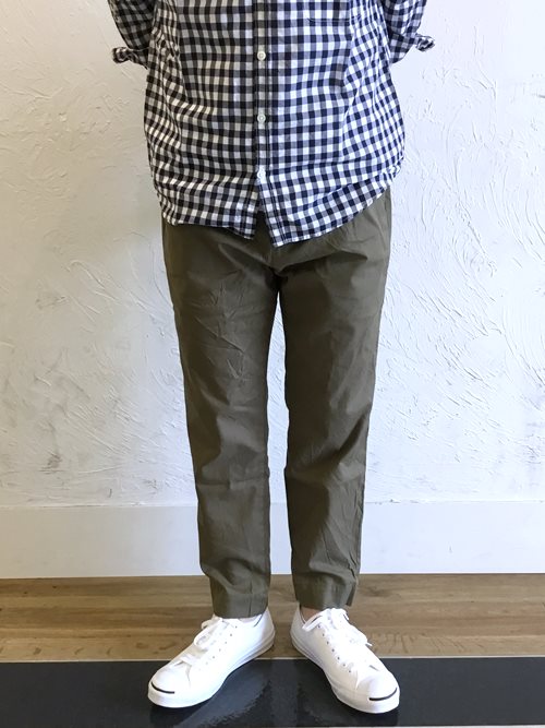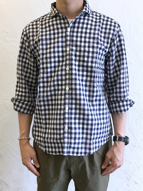 コットンリネンのギンガムチェックのシャツが清涼感のある爽やかなコーディネイト。
