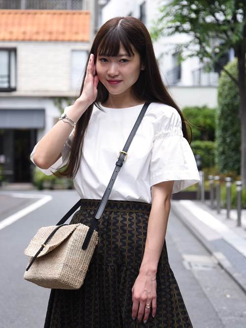 可愛らしい印象のブラウスを子供っぽくならないように、ダークトーンやヒールのサンダルで合わせたコーディネート◎