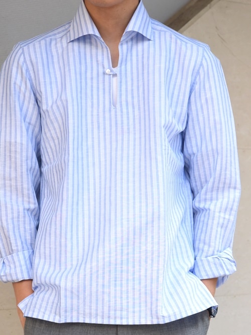 イタリア製で仕上げた上品なカプリシャツとアンクル丈のスラックスをあわせて程よいリラックス感のあるコーディネート。