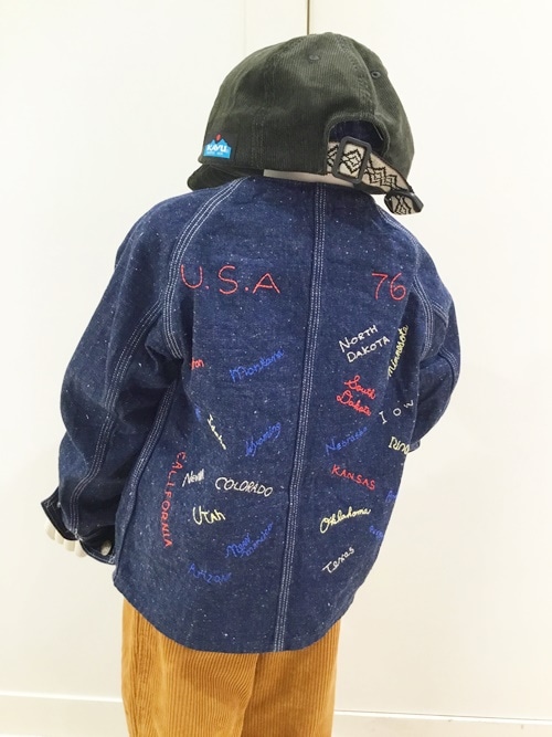 秋らしいイエローカラーのコードュロイパンツに、バックプリントの刺繍が可愛いCAL O LINEのジャケットを合わせました。肌寒い朝の1枚におすすめです!少し丈が短めなので、サイズを上げて、ゆったり着ても可愛いですよ☆