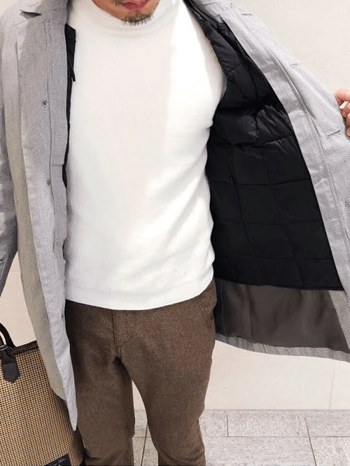 千鳥のコートはオンオフ兼用でライナー脱着可能なマストな一着。シャツの代わりにタートルで大人っぽくコーディネートしてみてはいかがでしょうか。