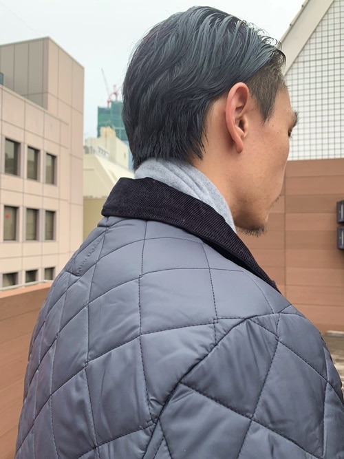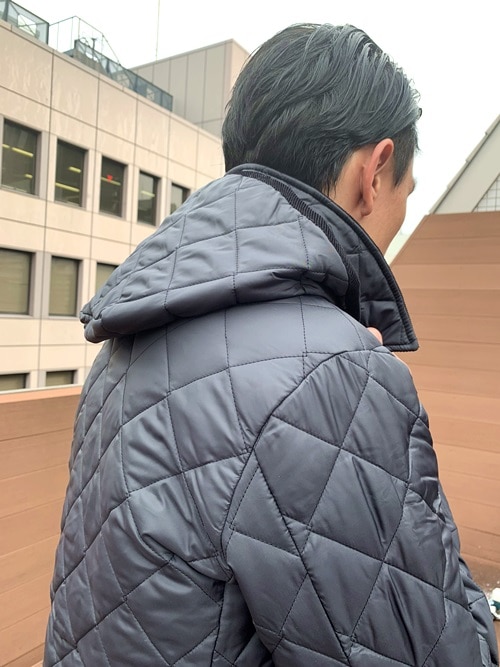 LAVENHAMのDENSTONを使ったコーディネート。 DENSTONは定番の形ですが、長めの着丈でスーツの上からでも気軽に羽織れます。フードの取り外しも可能なのでオンオフ兼用で使っていただけます。