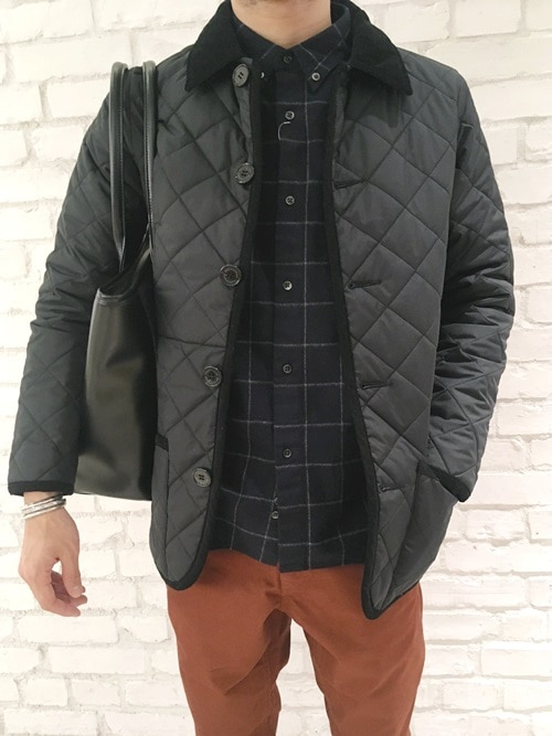 ウィンドーペンの柄が綺麗なボタンダウンのシャツは、インナーでも使い易く、襟付きのアイテムと合わせると、より上品な着こなしになります。 トレンドのテラコッタカラーのパンツを合わせて、コーディネートを暗すぎないようにしました。