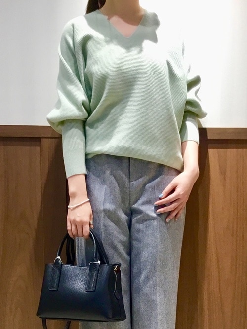 ミントグリーンのニット一気に春らしくなるこの時期の優れもの。寒色系でまとめて涼しげに。