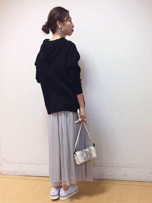 綺麗めスカートには敢えてカジュアルトップスを合わせて大人キレカジコーデに。気を抜きず、気取りすぎない取り入れやすいスタイリングです。