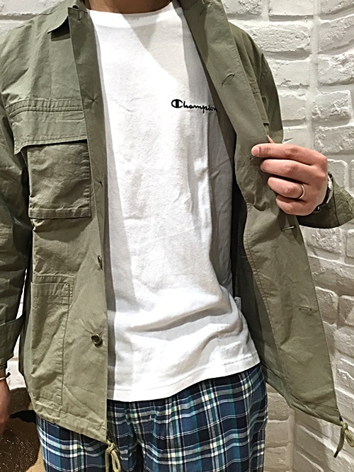 プレッピーなパジャマパンツにファティーグジャケットを合わせました。 チャンピオンTシャツはSHIPS JET BLUE別注モデル。ぜひ店頭にてご覧くださいませ。