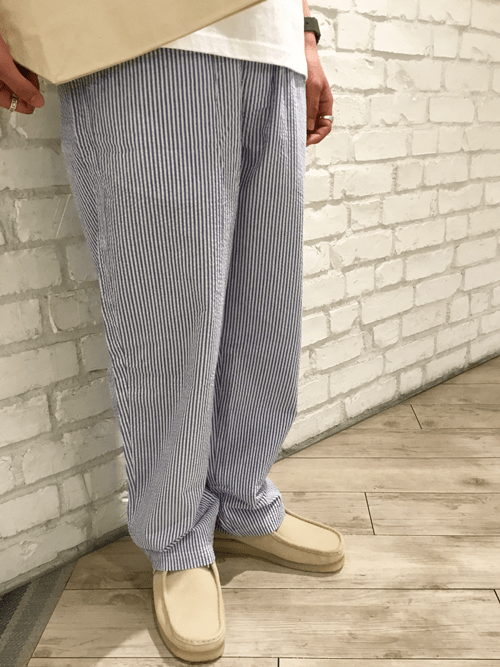 シンプルなシャツコーチジャケットを軸にインナーはボーダー、パンツはピッチの細いシアサッカーのストライプを合わせました。ジャケットを脱ぐと柄×柄ですが、ラフになり過ぎないように品のあるデザートブーツでバランスをとりました。