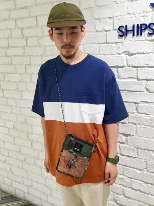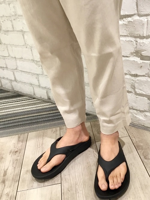 ネイビー、ホワイト、ブラウンのブロキングボーダーTシャツにリネンのスラックスを合わせ足元にはリゾート感のあるサンダルを合わせました。夏っぽさを出しつつシンプルなコーディネートになっています。