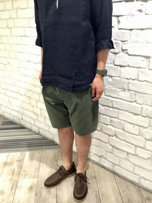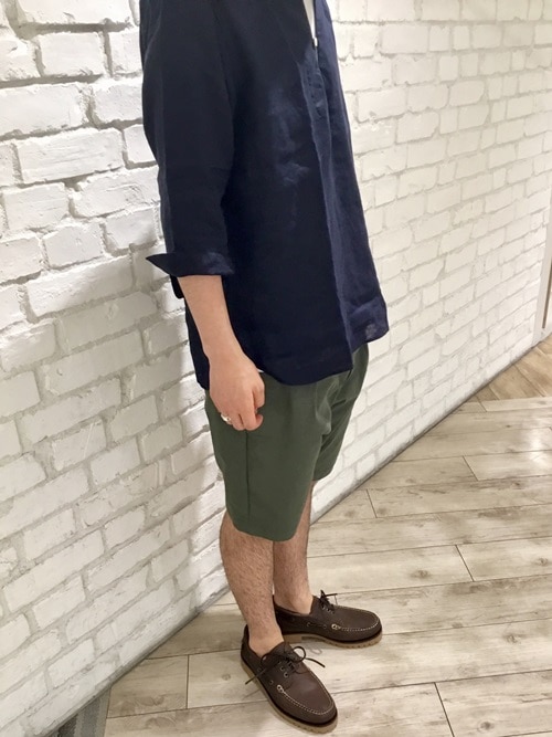リネン素材でネイビーのカプリシャツにオリーブ色のハーフパンツを合わせ、足元にはデッキシューズを合わせました。大人の雰囲気も出しつつ夏らしさも感じられるスタイリングになっています。