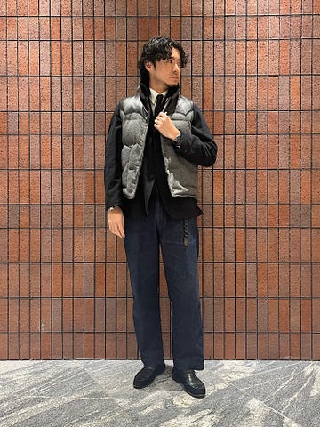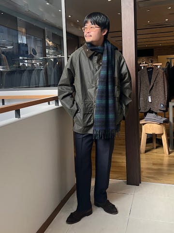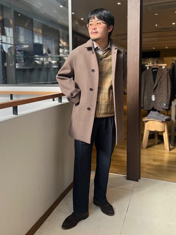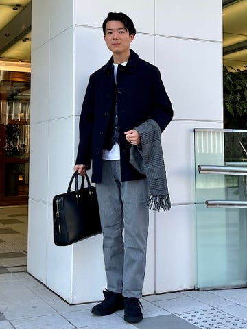 クラシカルな表情を意識した雨の日のドレスカジュアルスタイリングです。
