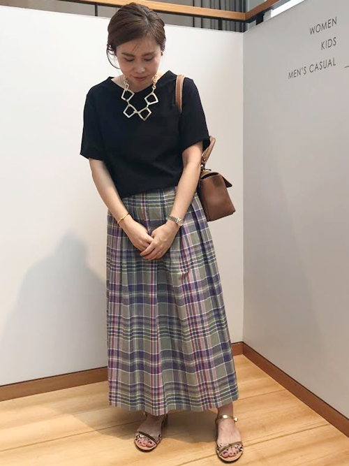 マドラスチェックのスカートに、黒トップスを合わせて甘すぎないコーディネートに!