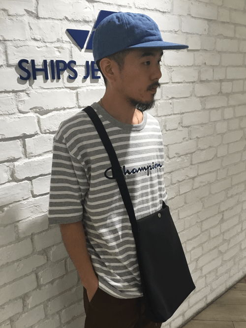 チャンピオンのTシャツをメインにパンツは晩夏のイメージしてリゾート過ぎないスタイリングにしました。
