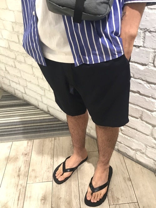 バンドカラーのシャツをメインにショーツと合わせました。トップスのブルーとショーツのネイビーで色味に統一感を持たせました。