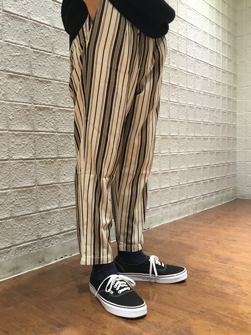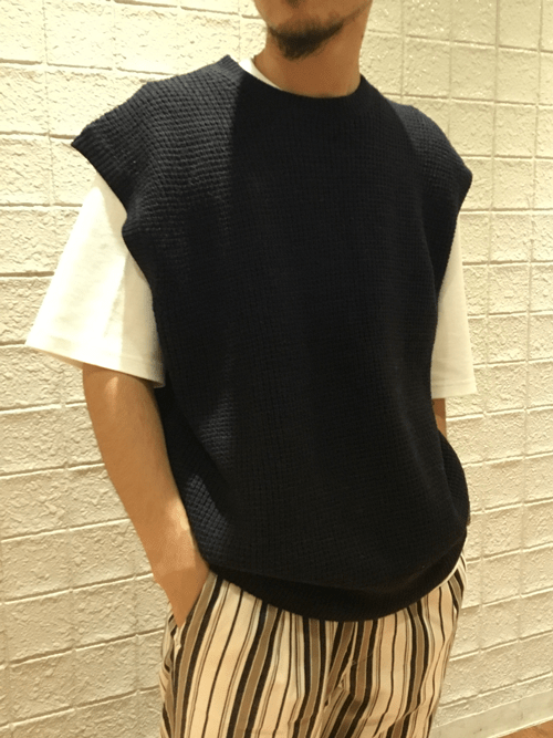 ビックシルエットのニットベストを主役にストライプのパンツを合わせることでスッキリとまとまりのあるコーディネートになっています。