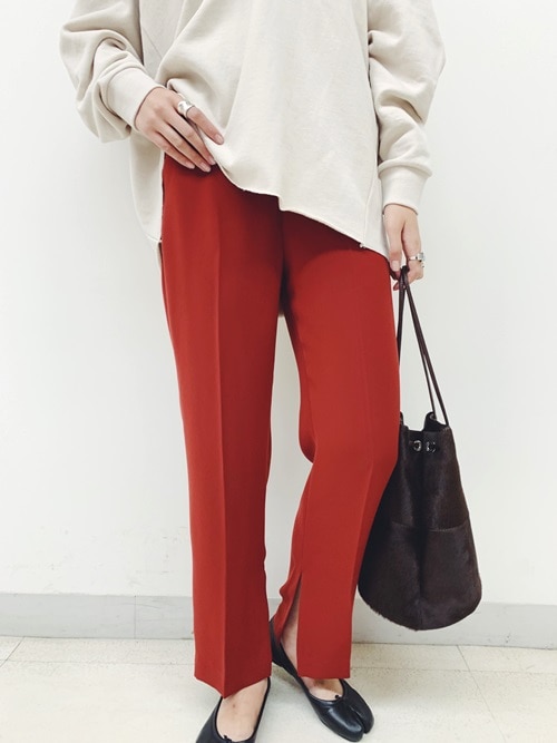 秋冬らしい落ち着いた色味のカラーパンツ。シルエットも綺麗で脚のラインもスッキリ見せてくれます。 オーバーサイズのパーカーと合わせカジュアルな着こなしに。