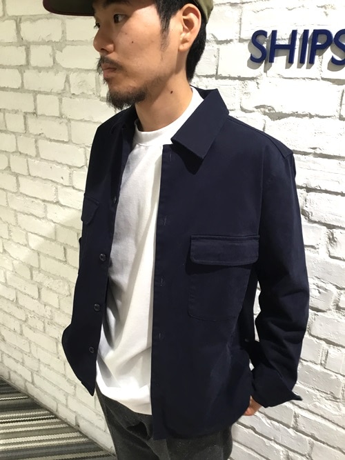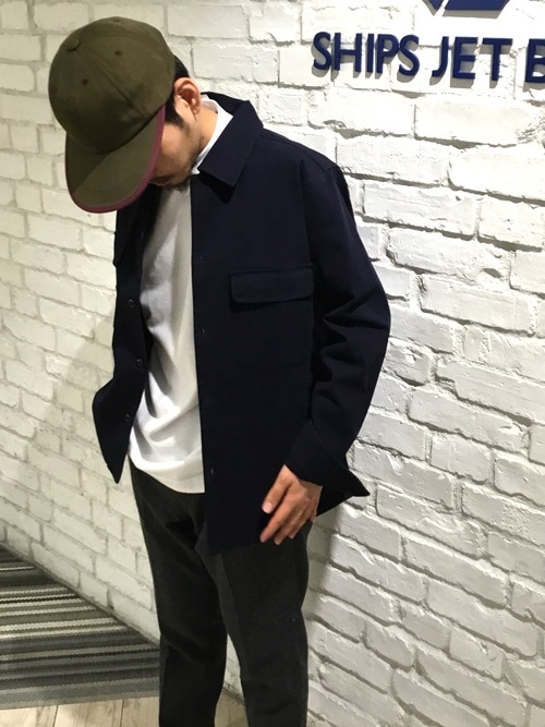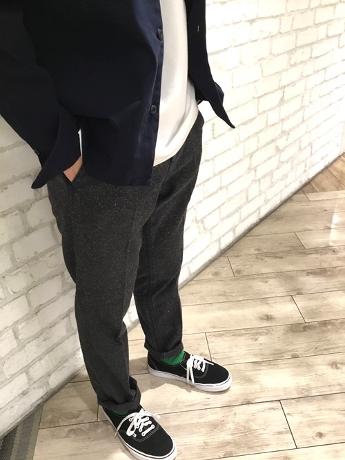 ネイビーのミリタリージャケットをメインにネップのパンツで秋冬らしさをプラスしました。ジャケットは撥水も効いているので気候が安定しないこの時期に重宝します!