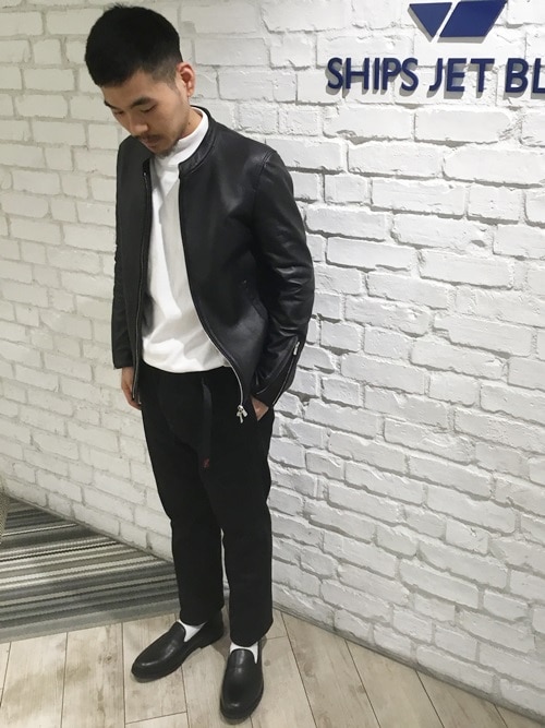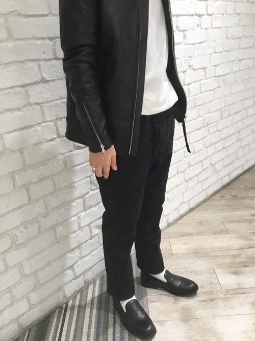 いさぎよくブラックコーデで、インナーは白で重たくなり過ぎないように調整しました。パンツはブラックデニムでトップスはレザーで、同色でも素材で変化をつけて単調にならないようにしたところがポイントです!