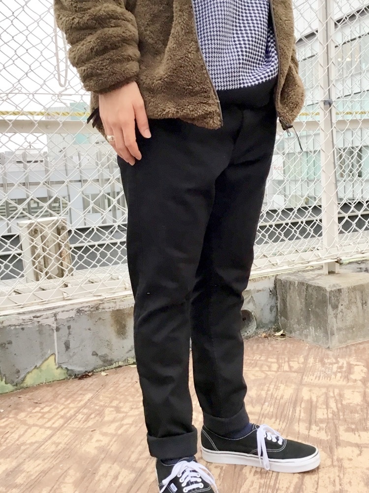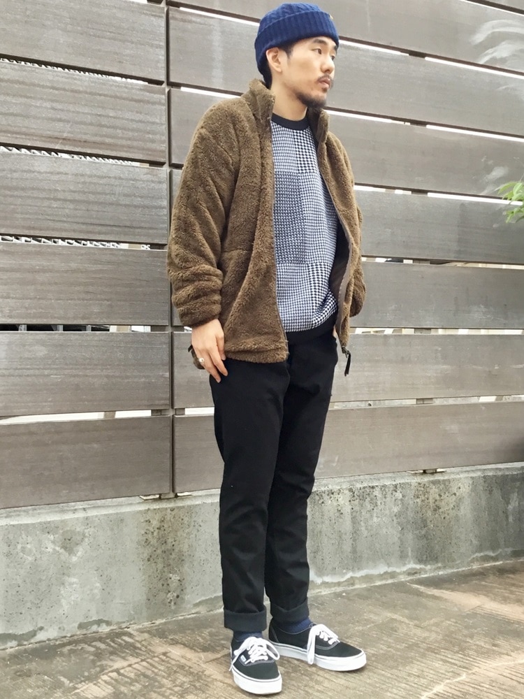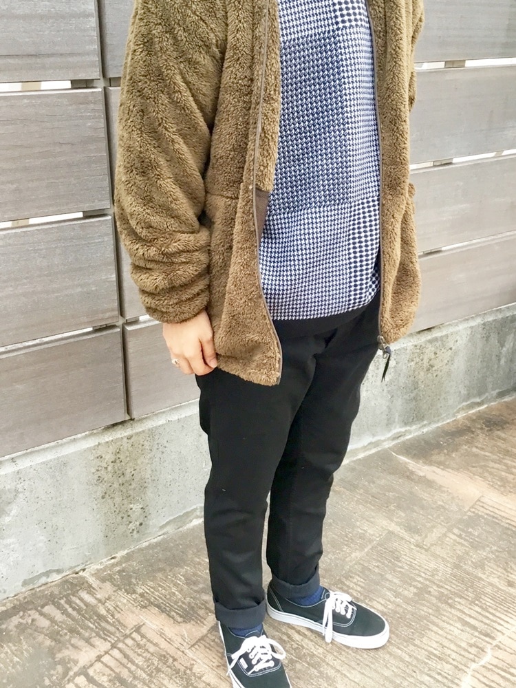 千鳥格子柄のニットの大人っぽさを活かしながらもカーキのボアジャケットで昇華したところがポイントです。