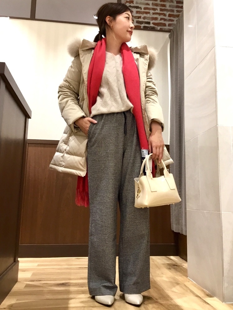 上品なベージュのダウンはパンツスタイルでメンズライクに。ストールのポイント使いで時別感をプラス。