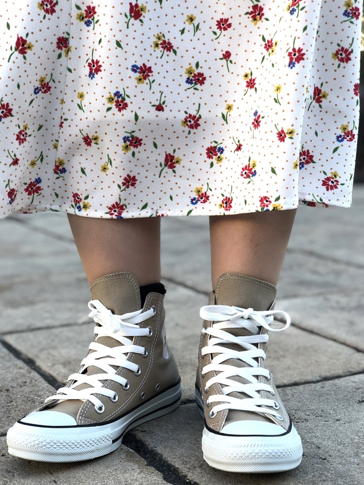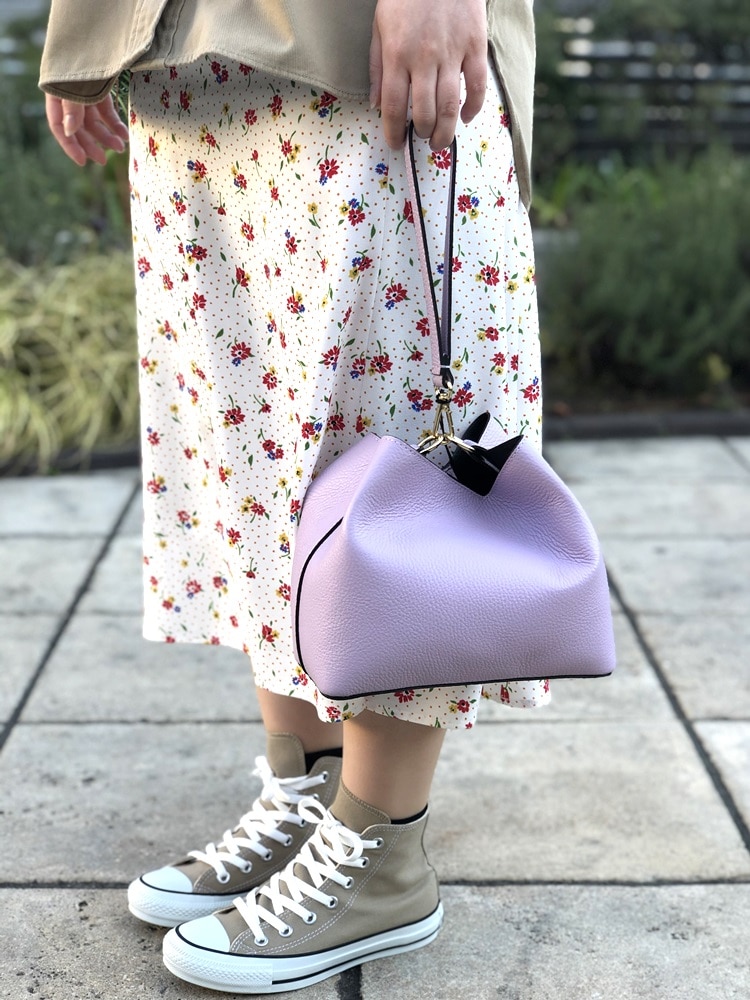 ベーシックカラーのジャケットに、ラベンダーのバッグとフラワープリントのスカートを合わせました!