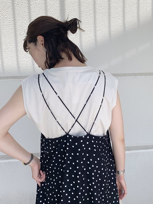 ドットのキャミワンピースを主役にカジュアルなコーディネートに。