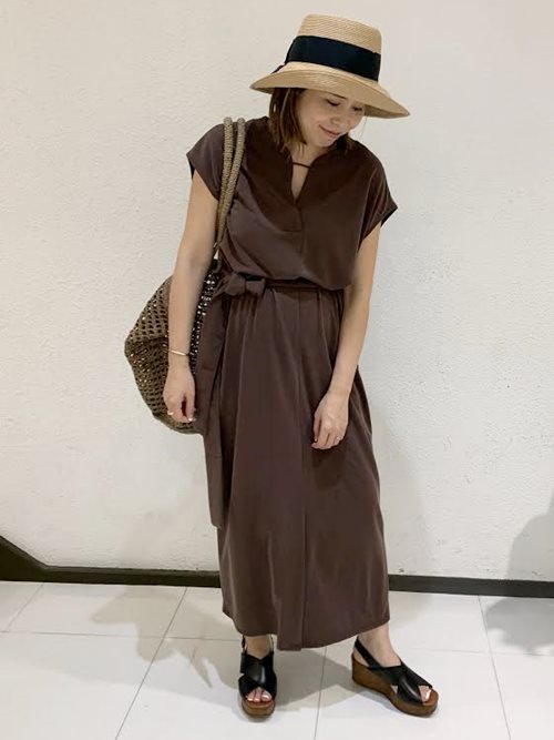 カットソーワンピースを小物使いでリゾート感を出しました。 とろみがあり肌触りがよく、女性らしいワンピースです。