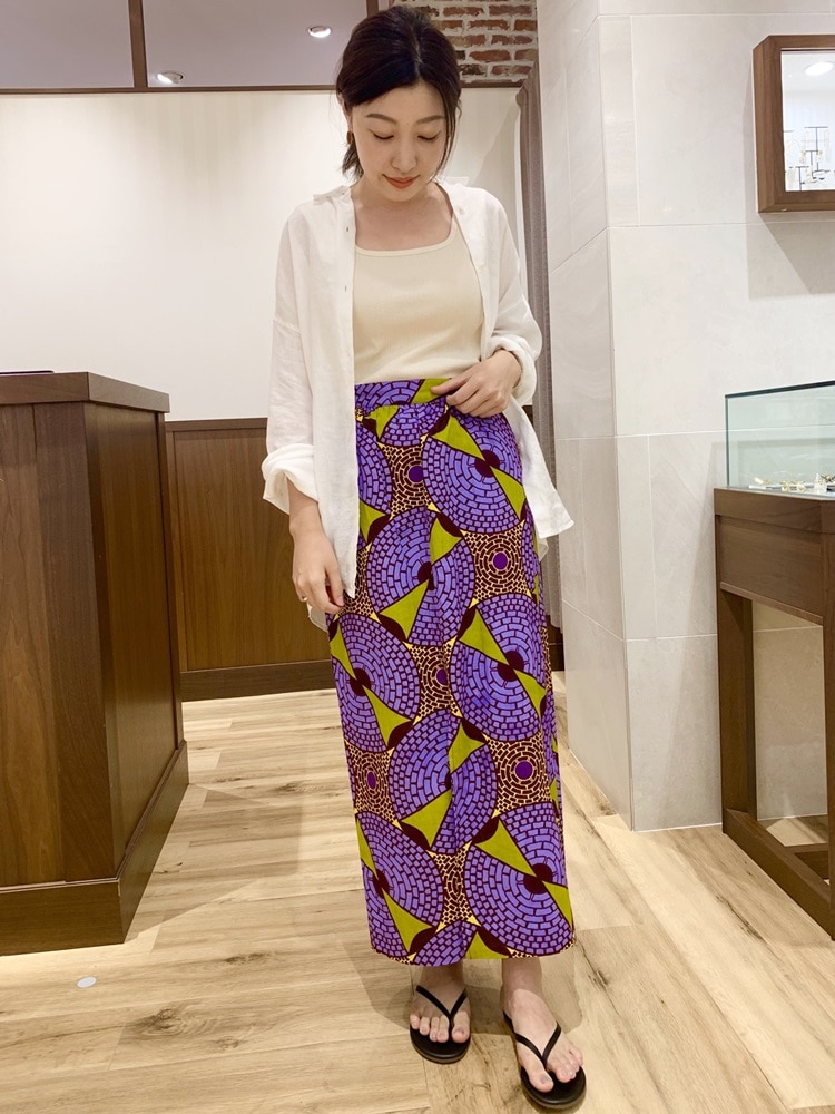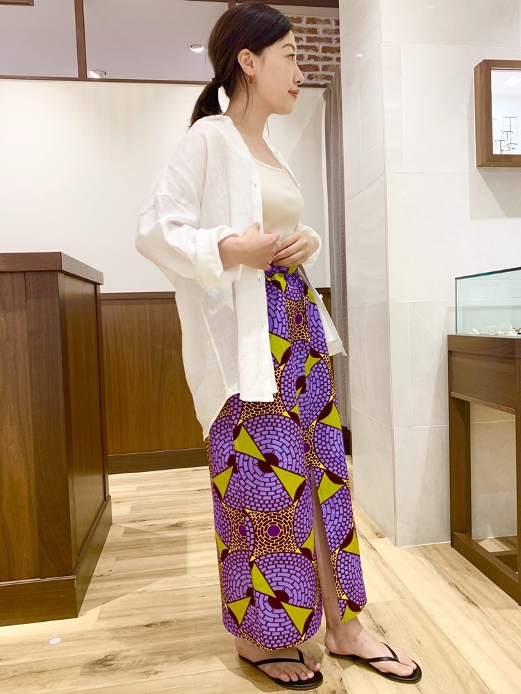 バティック柄の映えるリゾートコーデ。 トップスは綺麗目なリネンで涼しげに ◎ 【着用レビュー 】 着用アイテム:リネンシャツ 身長:153cm / 普段サイズ:36 / 着用サイズ:38 サイズ感:大きめ 素材感:柔らかい 着心地:風合いの良いリネン素材で肌あたり良いです。