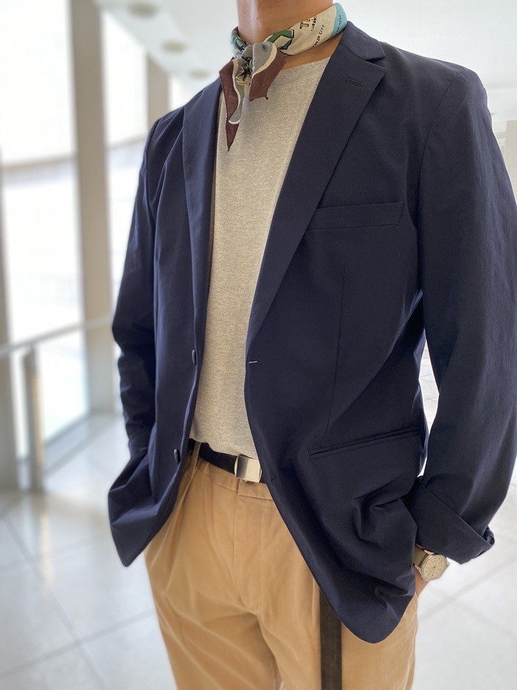 インナーはクルーネック、パンツはチノで合わせてカジュアルダウンしました。