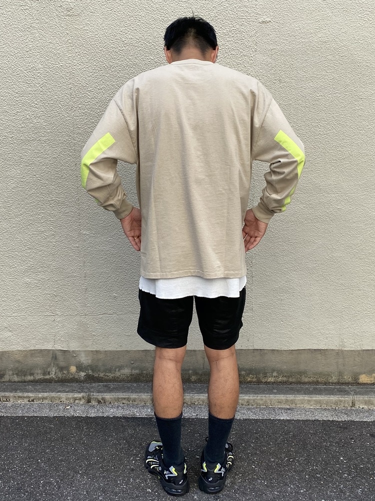 KAPTAIN SUNSHINEの別注のロングスリーブティシャツを使ったコーディネートです。 8月からショーツに合わせてかっこ良く、長いシーズン使ってもらえます! 袖のプリントが印象的で1枚でも様になります。
