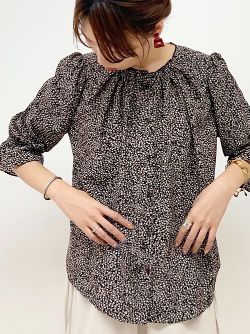 細かいプリントなので総柄でも着やすく、 首元や手元のギャザーがクラシカルで上品な印象に。