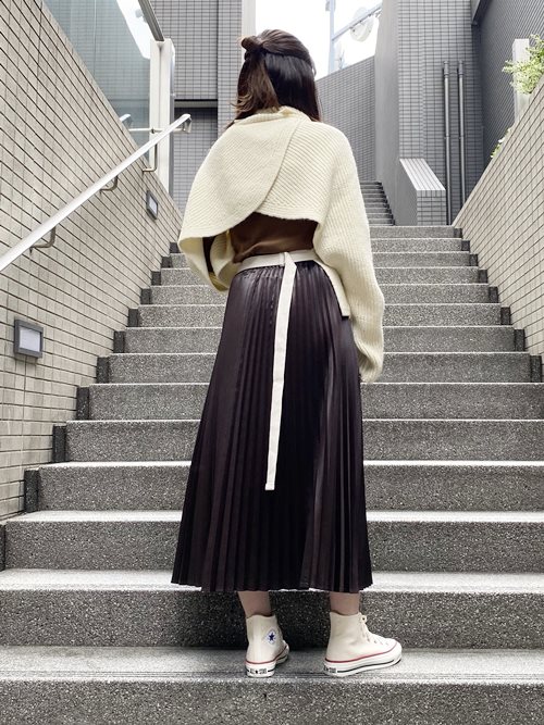 素材感・着心地:軽いですが落ち感があり、広がりすぎないシルエットです。また、カレンダー加工を施しているため、レザーのような独特の光沢感が特徴です。