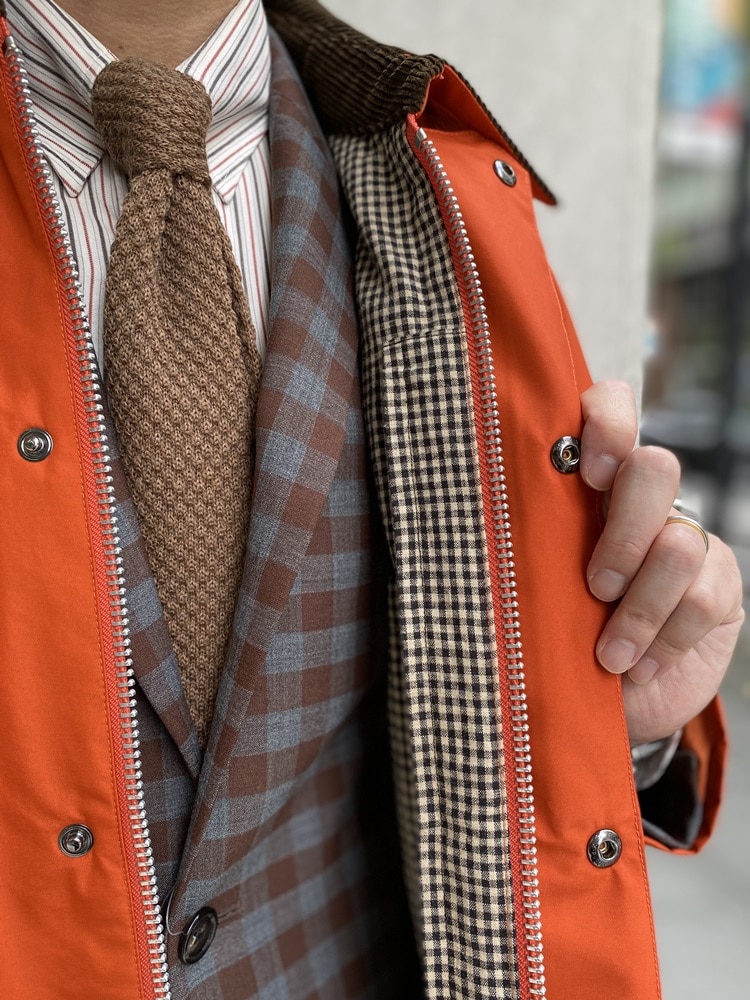 ■BARBOURのオレンジが引き立つように、ボトムやジャケットをモノトーンにしました。