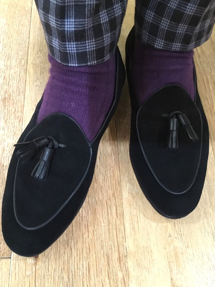 スエードのシューズ、ニットのタイでモノトーンの貫禄を和らげる工夫がポイントです。