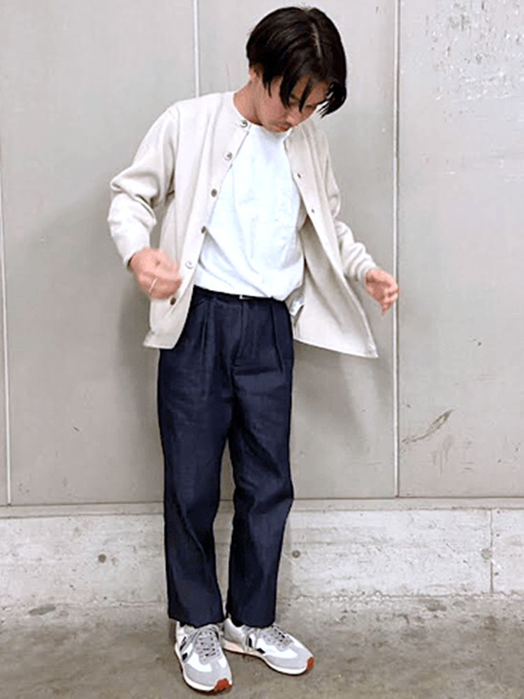 トムソンのパンツとバトナーのカーディガンを使った綺麗目なコーディネート