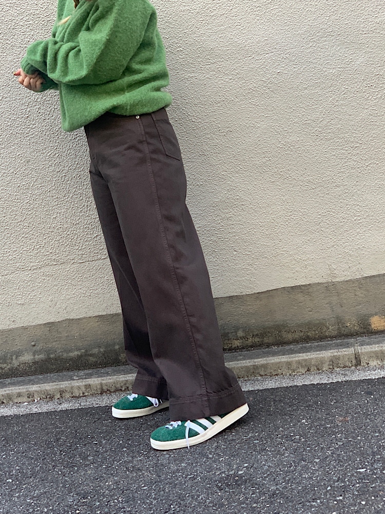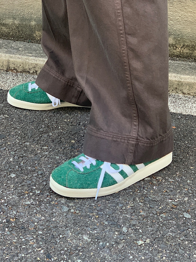 sneakers,グリーンのadidasのgazellevintageを着用しトップスの色に合わせました。